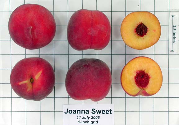 Plant Patent #10939 (June 1, 1999) of Zaiger Genetics, Modesto, CA. This new and unique variety of peach has the following desirable features that are outstanding in a new variety. The following features of the tree and its fruit are characterized with the tree budded on nemaguard rootstock, grown on Hanford sandy loam soil with Storie Index rating 95, in USDA hardiness zone 9, near Modesto, Calif., and with standard commercial cultural fruit growing practices, such as, pruning, thinning, spraying, irrigation, fertilization, etc.: 1. Heavy and regular production of large size fruit. 2. Fruit with a high degree of attractive red skin color. 3. Fruit with very firm flesh, good handling and shipping qualities. 4. Fruit with good, sweet, sub-acid flavor. 5. Fruit able to remain firm on the tree approximately 7 days past maturity (shipping ripe). 6. Vigorous, upright growth.