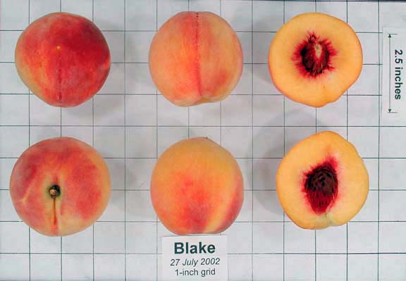 Orig. in New Brunswick, N.J., by M.A. Blake, New Jersey Agr. Expt. Sta. Introd. in 1953. J.H. Hale x Primrose; selected in 1953; tested as N.J. 117. Fruit: large, round; skin an attractive red, pubescence slight; flesh yellow, red around pit and suture, firm-melting, quality good, sometimes too acid, freestone; ripens 1 week before Elberta; freezing quality good; excellent for home canning; resembles J.H. Hale. Tree: productive; vigorous; chilling requirement 750 h; flower buds tender in winter but resistant to spring frost; susceptible to bacteriosis; flower small, nonshowy; leaf glands reniform. Named in memory of Professor M.A. Blake (1882-1947).