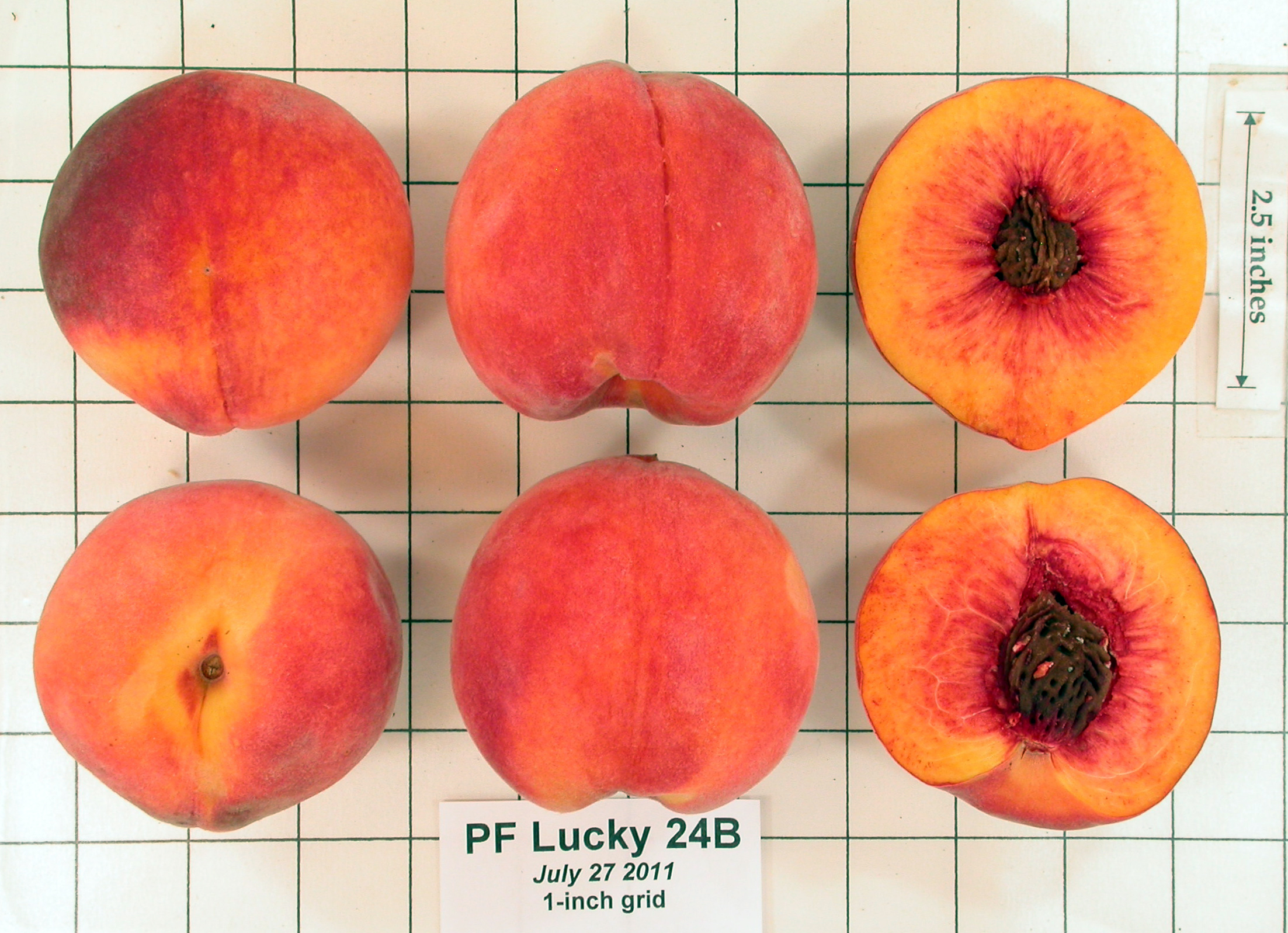 Originally tested as a selection, PF 219. Patented 12/16/2003. ORIGIN OF VARIETY: The new peach tree (hereinafter referred to as the `P.F. Lucky 24B` peach tree) was originated by Paul Friday in the experimental orchard, which is maintained for the purposes of breeding peach trees, at Paul Friday Farms Inc., located in Coloma, Mich. Coloma is located in the southwest section of Michigan. In an ongoing mass selection breeding program, superior seedlings of unrecorded parentage are maintained as seed sources for the production of seeds which are collected and planted in mass. The seed producing parent trees are maintaied solely as proprietary trees for breeding purposes and have not been released from the experimental orchard, where such trees can be evaluated for their adaptability to local and regional growing conditions. Seeds resulting from open pollination of the trees in the experimental orchard are regularly planted in mass to produce new populations of seedlings which are cultured and monitored to maturity. Trees with superior attributes are retained for further observation and testing, and contribute seeds to advancing generations of new populations of seedlings. The tree of this application, `P.F. Lucky 24B`, was a single plant from one such a seedling population, and was based on the numerous superior genetic attributes of this tree which are described in the botanical description to follow. While not comprehensive, the details of the botanical description to follow are believed to be a reasonably complete botanical description of the tree of this disclosure. ASEXUAL REPRODUCTION OF THE VARIETY The new and distinct variety of peach tree was asexually propagated by budding as performed in the experimental orchard of Paul Friday Farms Inc., located in Coloma, Mich. The asexual propagation demonstrates that such reproduction of the characteristics of the tree are consistent and are established and transmitted through succeeding propagation. SUMMARY OF THE VARIETY The new and distinct variety of peach tree is above average height and of upright growth and a regular and productive bearer of peaches. A distinct characteristic of the `P.F. Lucky 24B` peach tree is its medium vigor having growth of about twenty-four inches (24") per year. The blossoms bloom in mid-season and are characterized by being contracted or partially spread to approximately 3/4-inch when in full bloom. At the same time the five petals of the blossoms are of lesser length than the length of petals of the normal showy blossom as exemplified by the `Loring` (unpatented) peach blossom. The blossoms of the present peach tree at full bloom may be characterized as being non-showy. More specifically, the blossoms of the present peach tree have radially projecting and angularly spaced five blossom petals to form a blossom having a diameter of about 3/4-inch measured across the blossoms. The flesh of the fruit of the present peach tree is extremely firm and is yellow. The skin is smooth having moderate to little down and is of dark red color overlying a yellow ground color. The yellow background covers approximately twenty percent (20%) of its surface at maturity. At maturity, the peach is spherical having an average diameter of about 23/4". The fruit produced by this tree has firm, and non-melting flesh, and thereby has the attendant resistance to blemishes and soft spots in harvesting, shipping and handling due to bruising. The firmness of the fruit flesh is sufficient to allow the flesh to yield and be restored when bumped or dropped without the resulting soft spots as would be experienced in most late season peaches of this market class. Thus, fruit of this tree remains more attractive to the ultimate buyer, the consumer, and thereby will command premium prices for the late fresh desert market. The fruit matures in the latter part of the peach growing season of southwestern Michigan. The fruit as mentioned heretofore is of dark red color overlying a yellow which covers approximately twenty percent (20%) of its surface and has a very attractive appearance.