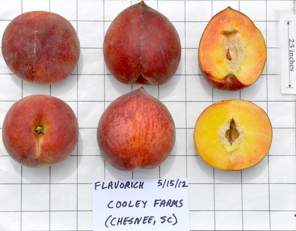 Also known as Flavorich (incorrectly) in the trade. Rich May (Plant Patent #7,432) is from Zaiger Genetics in Modesto, CA. Patent was issued January, 1991. A new and distinct variety of peach tree; its novelty consisting of the following unique combination of desirable features. 1. Early maturity of fruit. 2. Producing large size, yellow flesh fruit. 3. Heavy and regular production. 4. The ability of the fruit to stay firm 4-5 days after maturity. 5. Vigorous upright growth habit. 6. Producing firm fruit with good handling and shipping quality. The fruit is further characterized in comparison to the variety May Crest Peach (U.S. Plant Pat. No. 4,064) as maturing 4 to 5 days earlier with heavier production of larger size fruit. The present variety of peach tree was originated by us in the experimental orchard located near Modesto, Calif. as a cross between two selected seedlings with the field identification numbers 34GA1155 x 36EB346. The female parent 34GA1155 was a cross between a selected seedling from a May Grand Nectarine (U.S. Plant Pat. No. 2,794) crossed with a peach of unknown parentage. This selection was then crossed with an open pollinated seedling of Sam Houston Peach (non-patented). The pollen parent 36EB346 originated from a first generation cross of Tasty Gold Nectarine (U.S. Plant Pat. No. 5,623) crossed with May Crest Peach (U.S. Plant Pat. No. 4,064).