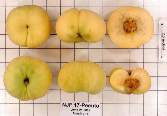 Patented by Dr. J. Goffreda (Rutgers University) on October 28, 2008 (Plant Patent #19,383). A new and distinct peach variety of Prunus persica named `NJF17` is distinguished from other peach varieties by its unique combination of non-showy, light pink flowers, flat fruit that ripen in early mid-season, bright green-yellow to yellow fruit that are devoid of over color, clingstone fruit with a juicy, nonmelting texture and sweet, spicy flavor, and firm fruit that retain their firmness well. Marketed as TangOs II by Adams County Nursery, Aspers, PA.