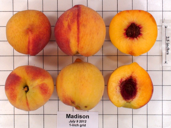Released from the Virginia Agricultural Experiment Station, Blacksburg in 1963. Ripens 7 days before Elberta. This variety is one of the most winter hardy varieties available. The fruit is medium to large, uniform in size and of exceptional quality. Madison is recommended for northern climates where peaches are sensitive to low winter temperatures. Okie notes that skin is tender and subject to severe flesh browning. Leaf glands are reniform and flowers are nonshowy. 850 chill hours. From Adams County Nursery.