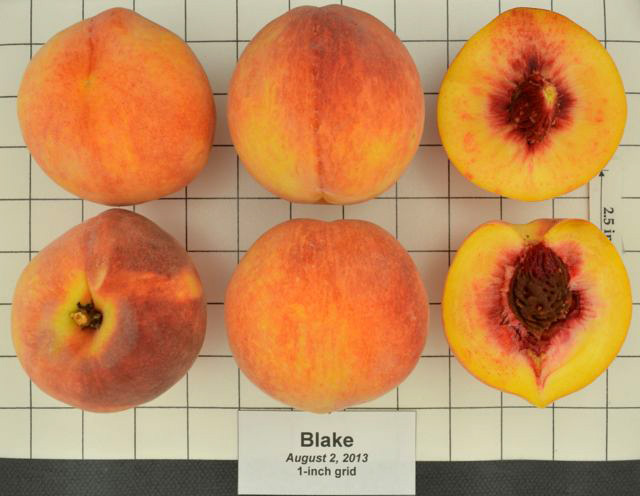 Orig. in New Brunswick, N.J., by M.A. Blake, New Jersey Agr. Expt. Sta. Introd. in 1953. J.H. Hale x Primrose; selected in 1953; tested as N.J. 117. Fruit: large, round; skin an attractive red, pubescence slight; flesh yellow, red around pit and suture, firm-melting, quality good, sometimes too acid, freestone; ripens 1 week before Elberta; freezing quality good; excellent for home canning; resembles J.H. Hale. Tree: productive; vigorous; chilling requirement 750 h; flower buds tender in winter but resistant to spring frost; susceptible to bacteriosis; flower small, nonshowy; leaf glands reniform. Named in memory of Professor M.A. Blake (1882-1947).