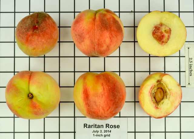 Orig. in New Brunswick, N.J., by M.A. Blake, New Jersey Agr. Expt. Sta. Introd. in 1936. J.H. Hale x Cumberland; cross made in 1926; tested as N.J. 97. Fruit: medium to large; round, ridged along suture; skin attractive red; flesh white, streaked red, fine-textured, soft, melting, watery, freestone; ripens 4 weeks before Elberta; quality good. Tree: vigorous, spreading, productive, hardy, tolerant to bacteriosis; flower small, fairly showy; leaf glands reniform; chilling requirement 1150 h.