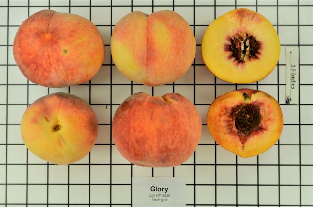 Glory.-Orig. at Louisiana Agr. Expt. Sta., Calhoun; selected in 1977, tested as L73-1-32, and released by C.E. Johnson in 1992. LaPremiere x (Redglobe x Cardinal). Fruit: nearly round; 50% attractive red blush over golden-yellow ground color with short pubescence; flesh deep yellow with red near pit, melting, firm, freestone. Ripens 5 to 7 days before Elberta. Flowers showy, rose-colored; leaf glands globose. Trees: moderately high resistance to bacterial spot. Chilling requirement 800 h.